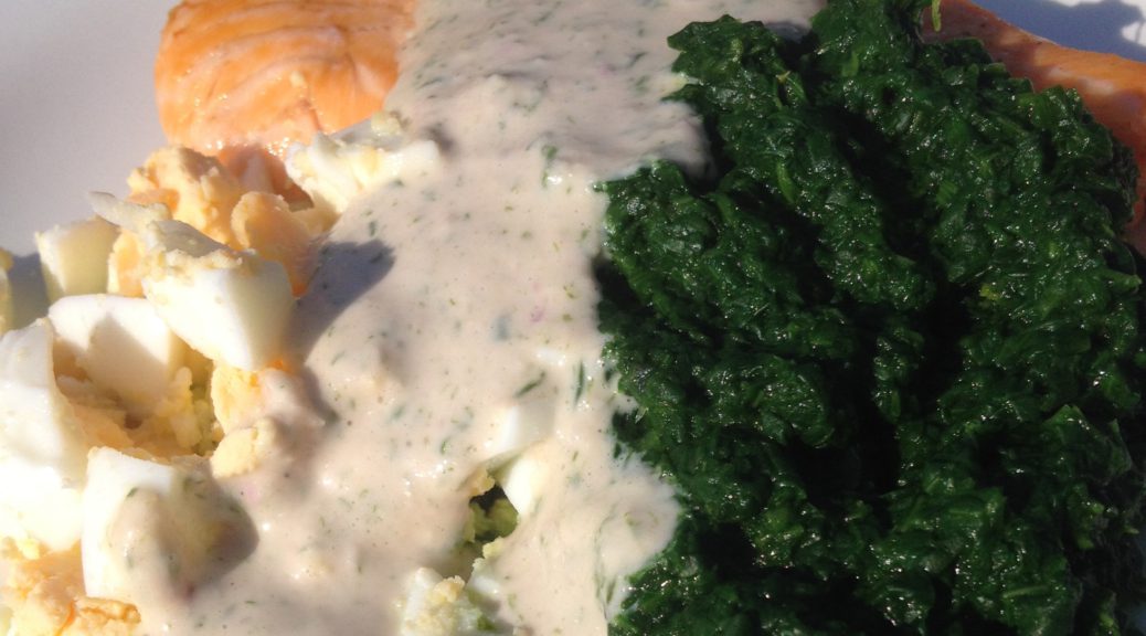 Snabb ugnsbakad laxfile med spenat, kokt ägg och en kall sås med smaker av rödlök & gräslök.